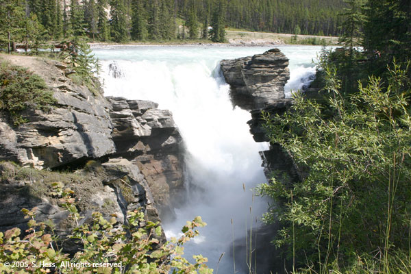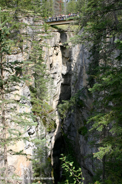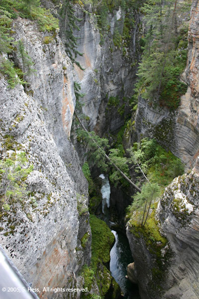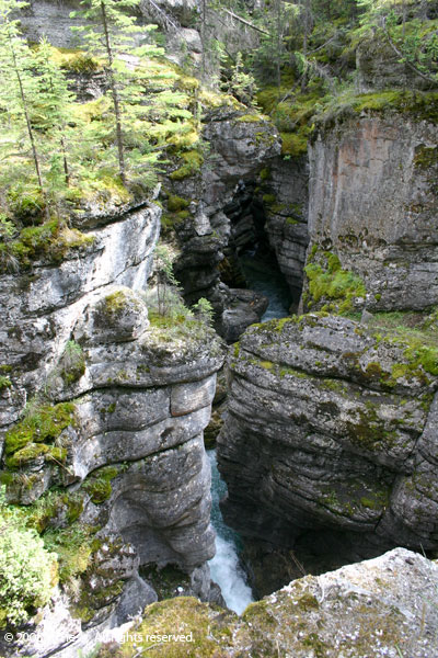 We drove 60 miles (100 Km) south to the Columbia Icefield Center. The Columbia Icefield is the largest body of ice in the Rocky Mountains (130 square miles/325 square Km). From it flow several glaciers, including the Athabasca. The icefield is unique in that its meltwaters drain to three oceans. Some of the water, such as the Athabasca Glacier's, flows through the Athabasca River to the McKenzie River system to the Arctic Ocean. Other water flows through the Saskatchewan River system to Hudson's Bay and the Atlantic. The third drainage flows through the Columbia to the Pacific. We followed that Athabasca River back to Jasper, stopping for lunch overlooking the drainage channels that form the Athabasca River. Our second encounter with animals came when we spotted Mountain Goats (two females and two kids). This is not a common occurrence, as these animals are usually found on higher elevations. The goats were licking the minerals on the ground adjacent to the Icefields Parkway. About 19 miles (30 Km) south of Jasper are the Athabasca Falls where the river drops over into a narrow canyon. Finally, we went to Maligne Canyon, 6 miles (11 Km) northeast of Jasper. Here the Maligne River runs through a deep slot canyon on its way to the Athabasca River. Unfortunately the day did not end as it started, rain came in this evening and it looks like tomorrow will be wet. This turn in the weather was forecast and is the reason we tried to pack so much into our first day in the area. |