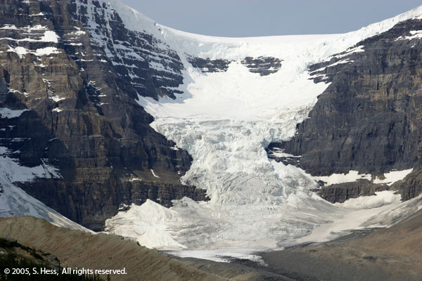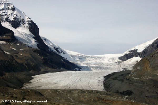 Lateral Moraine, rock and gravel left by the receding Athabasca Glacier is seem in the lower left. At the top, the Columbia Icefield can be seen as a cap on the mountains.
