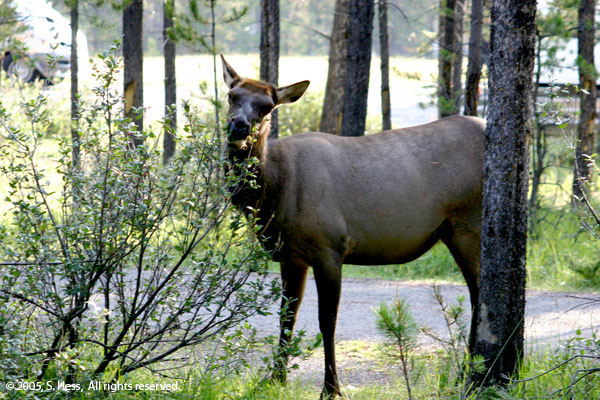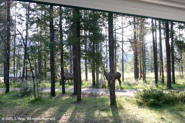 | We woke up to a gorgeous day with company, two elk cows, having their breakfast 30 feet (10 meters) outside our door. That experience served to remind us of where we are. Jasper National Park is home to a large variety of animals, some of them dangerous. Warning signs are everywhere reminding campers that this is bear country. The campground literature warns of other animals that can be a threat to humans such Cougars, Coyotes and Elk (which will charge when they feel threatened). As if to emphasize this point, you cannot miss the bear trap that sits at the entrance to the park.