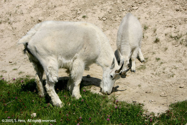 Mountain goats licking minerals along the Icefields Parkway. The adult is still shedding last year's winter coat. She will start to grow a new coat shortly.