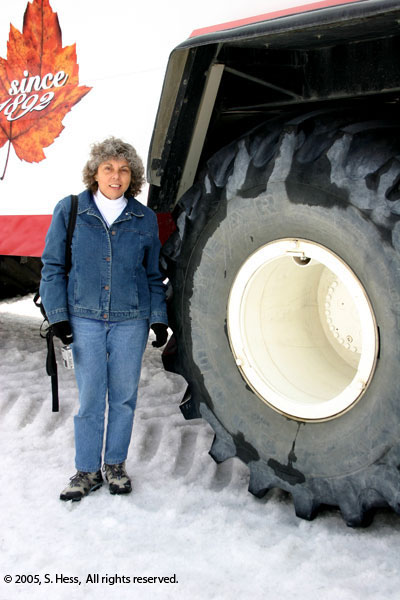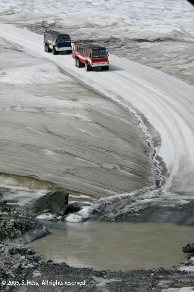 Snowcoaches on the Athabasca Glacier. The meltwater flow is intentionally allowed to pool so that the tires are rinsed as they pass through. Dirt on the tires would increase the melting rate of the glacier. Note the size of the tires, at right.