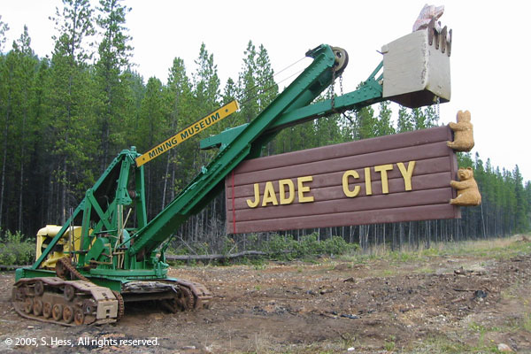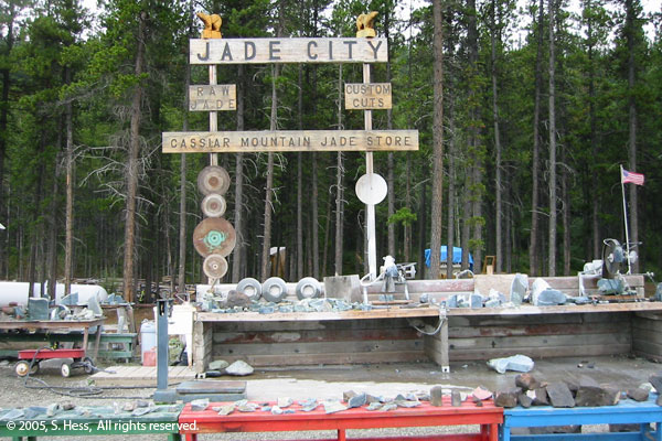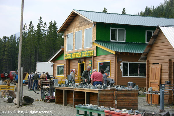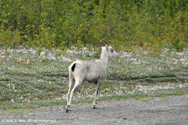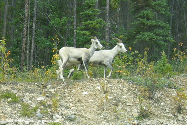 Today's journey took us on the Alaska Highway for half the trip and then on to the Cassiar Highway. The Alaska Highway portion was relatively easy with the exception of two bridge repair sites so we made good time. We had read that the Cassiar is not paved for about 100 miles of its length. We had also heard horror stories from travelers, one of whom turned back rather than drive on the unpaved section. The first 100 miles of the road were oiled gravel and were not in terrible condition. We then hit a 15 mile stretch of loose gravel which probably turns to mud when it rains. We were on the unpaved section for less than a mile when a passing truck threw a rock which put a big crack in our windshield. We are now one of the many victims of the northern highways. The Cassiar Highway is one of the loneliest roads we have traveled. In the 150 miles we drove today, Dease Lake, our destination, is the only town of any size. There are one or two others that only have a couple of houses and no services. Speaking of services, you don't enter the Cassiar Highway without a full tank of gas. There is only one gas station between the northern end of the highway and Dease Lake and it was out of gas. Most drivers fill up at a gas station at the intersection of the Alaska and Cassiar highways and it was also out of gas. We drove an extra 26 miles to ensure that we entered the highway with a full tank. One of the stops every tourist driving the Cassiar makes is Jade City. There are jade mines in the area and Jade City has two gift shops selling chunks of jade as well as carvings and jewelry. Of course, we stopped, looked and bought nothing. The other attraction is the wildlife. The guide books tells us that because the highway is undeveloped it has a lot of wildlife. We saw two small flocks of Stone Sheep. Our luck in spotting the animals on and off the road has not been very good. |