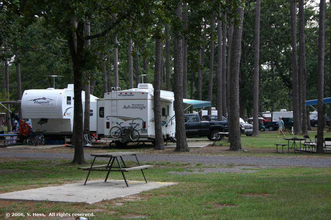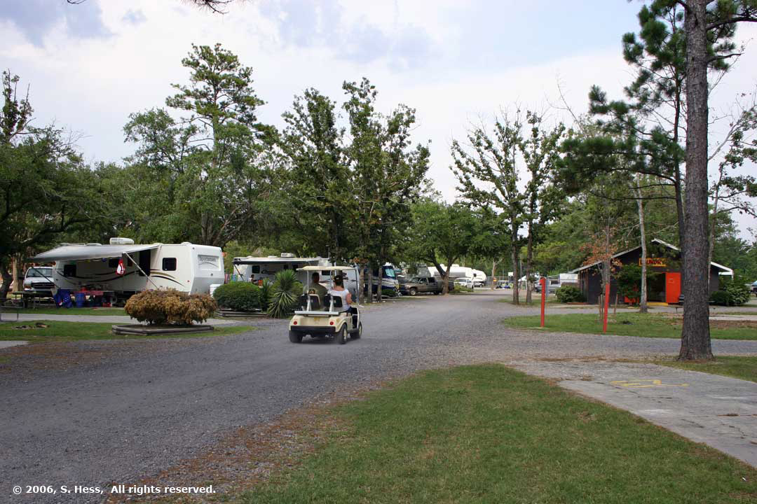Today we arrived at Robert, Louisiana, our home until Tuesday. Robert is located north of Lake Ponchartrain, 50 miles from New Orleans. Susie is participating in the annual American Library Association meeting. Our preference would have been to camp closer to New Orleans, but hurricane Katrina put an end to those thoughts. The campground we had used on previous visits to the city is full of FEMA trailers housing construction and relief workers. Reservations at that campground were not available until a few weeks ago, and then only on a limited basis. The other alternative campground is still closed. We had identified some other possibilities, but a local friend strongly suggested that we look north of the lake. The trip from Creola, AL was relatively easy. We covered the distance in about three hours. We picked up Interstate 10 in Mobil and headed west. We anticipated seeing quite a bit of damage along the route, but other than some damaged billboard and downed trees we didn't see much. The highway runs a few miles north of the coast and the towns that received the heaviest damage in Mississippi and Louisiana are south of the highway and not visible from it. I plan on going to the parts of New Orleans that were seriously damaged from the flooding and wind and will post some pictures later during this segment of our journey. Many of the people following us have little or no idea of what campgrounds are all about so I thought I would take some pictures of Yogi Bear's Jellystone Park, where we are staying. This campground is really not representative of many of the places we will be staying. The Jellystone Parks "brand" is more of a destination park. It is geared to family camping with activities for the adults and the children. This particular campground (see http://www.jellystonela.com/ ) has several hundred sites, a large recreation hall, store, playground, swimming pool and several bath houses. Many of the sites have concrete pads that make leveling the trailer easier (of course, our site is the only one in this section of the campground that doesn't have the pad). It appears that there are many people who leave their trailers here on a permanent basis and use it as a getaway home. This campground has lots of trees that provide some shade (welcome in this weather). As a contrast, the campground we stayed in last night had about 70 sites and was geared to transients coming in for an overnight stay. It had limited facilities and no pool. It appears to have what seemed like a lot of construction workers who are staying there while working on Katrina damage. |