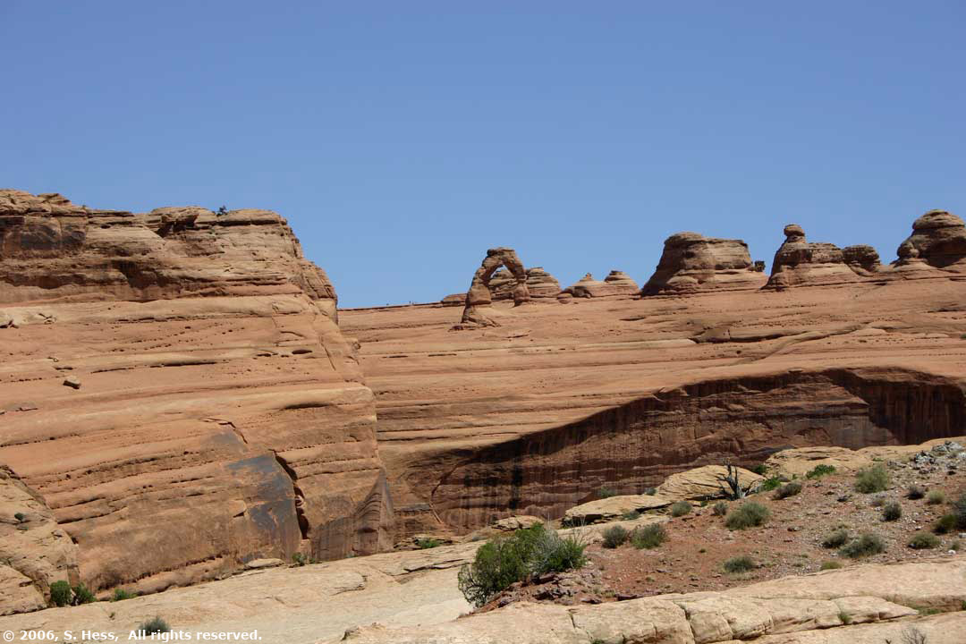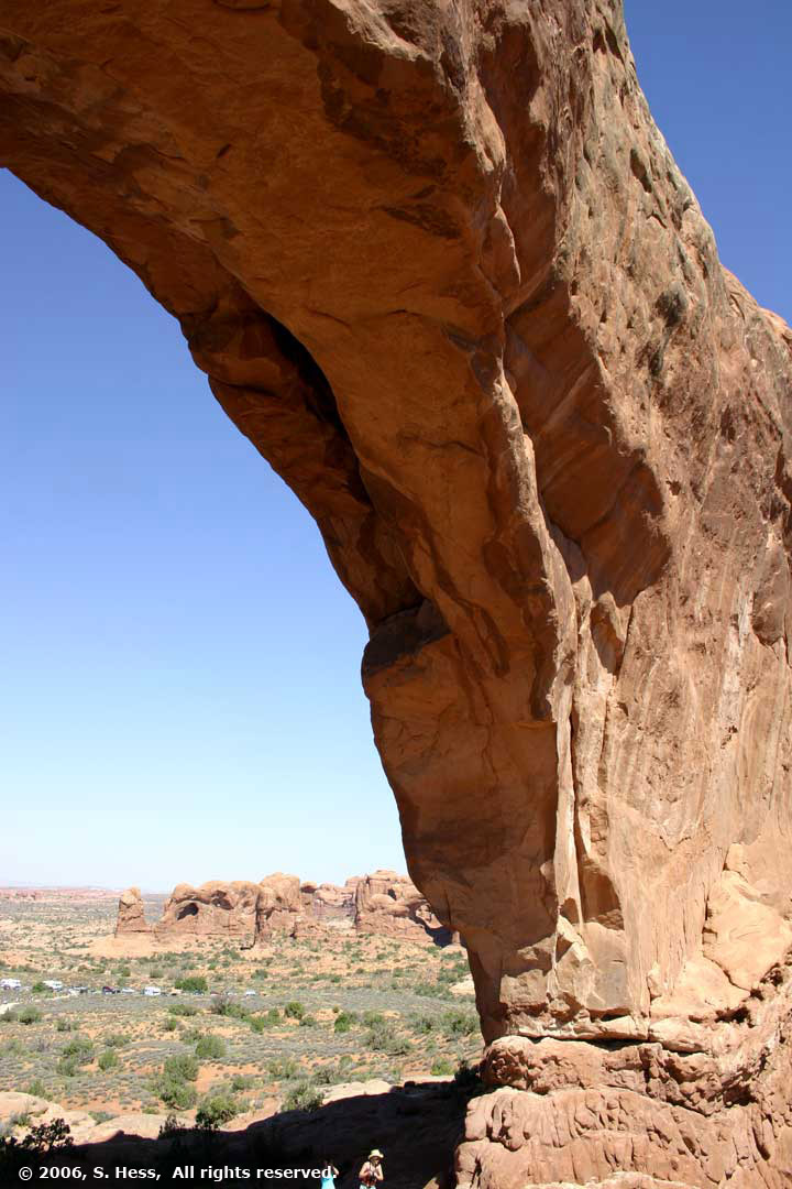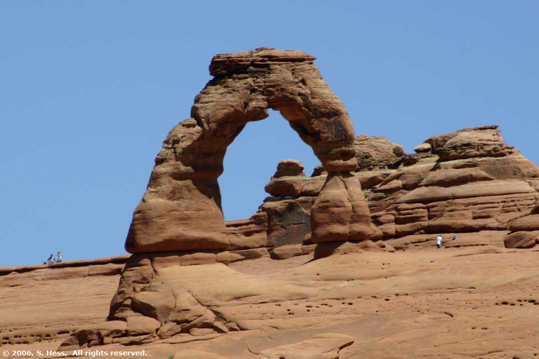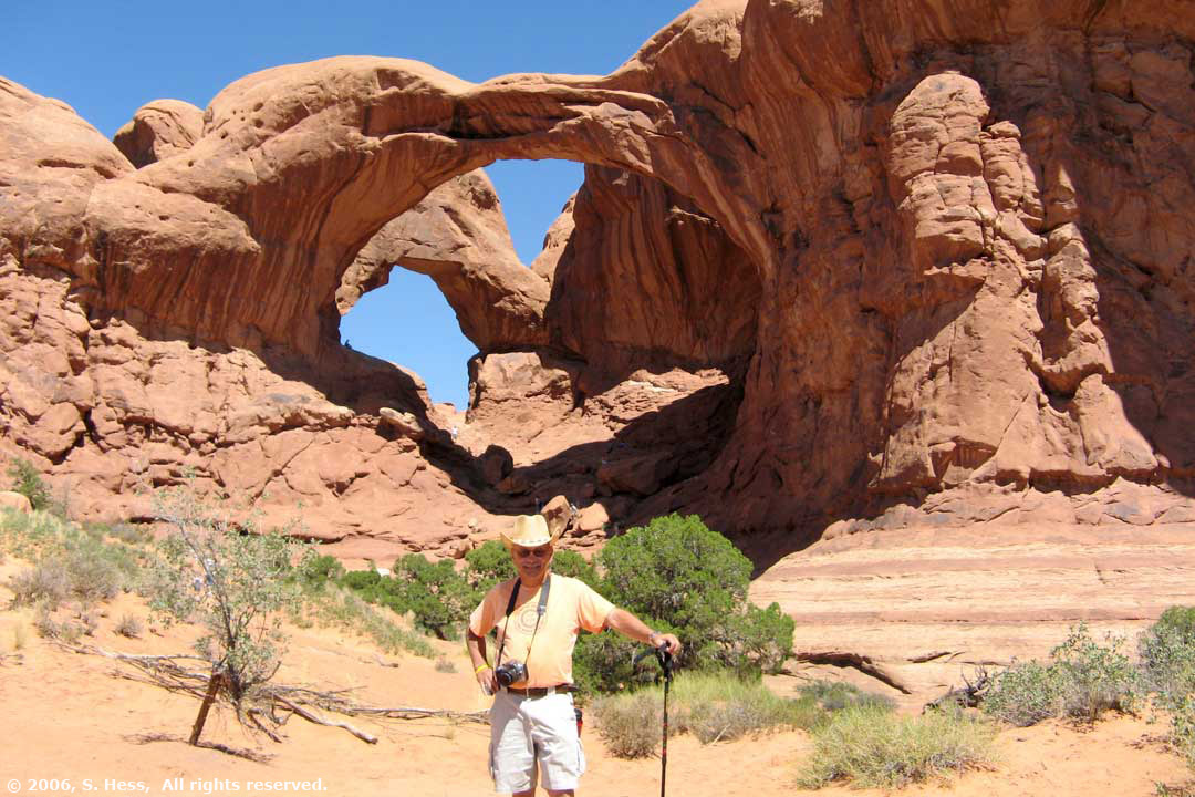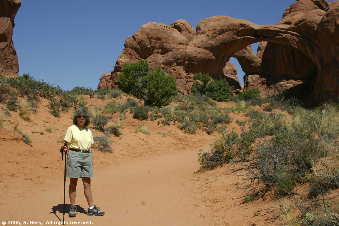 This morning we set out for Arches National Park. The entrance is about 9 miles north of the campground. The formations in the park are spectacular. We did most of the trails but the furthest, Devil's Garden. You really need at least two days (really two mornings if you get an early start) to do justice to Arches. Devil's Garden is the longest maintained trail in the park, roughly 8 miles. The literature recommends that you allow at least 2-3 hours each way. By the time we got to the entrance to Devil's Garden, it was already past noon and the heat was getting to us. Arches National Park has the largest amount of natural stone arches in the world. We only saw a few, including some of the best known, Delicate Arch, which appears in Utah's license plates, and Double Arches. The Devil's Garden trail has eight arches. In addition, it has thousand of other natural formations. All of the formations in the park are the work of wind and water. Some of the trails are reasonably easy to tackle and others are more severe. For example, to see the Delicate Arch, you can hike a strenuous three mile (round trip) trail that gets you to the base of the arch. The alternative is going to the Delicate Arch Viewpoint. Even this alternative gives you choices, a hundred yard flat trail to a viewpoint or a moderately strenuous hike to the upper viewpoint. The pictures of the Delicate Arch, below, were taken from the upper viewpoint. Arches National Park Scenes |