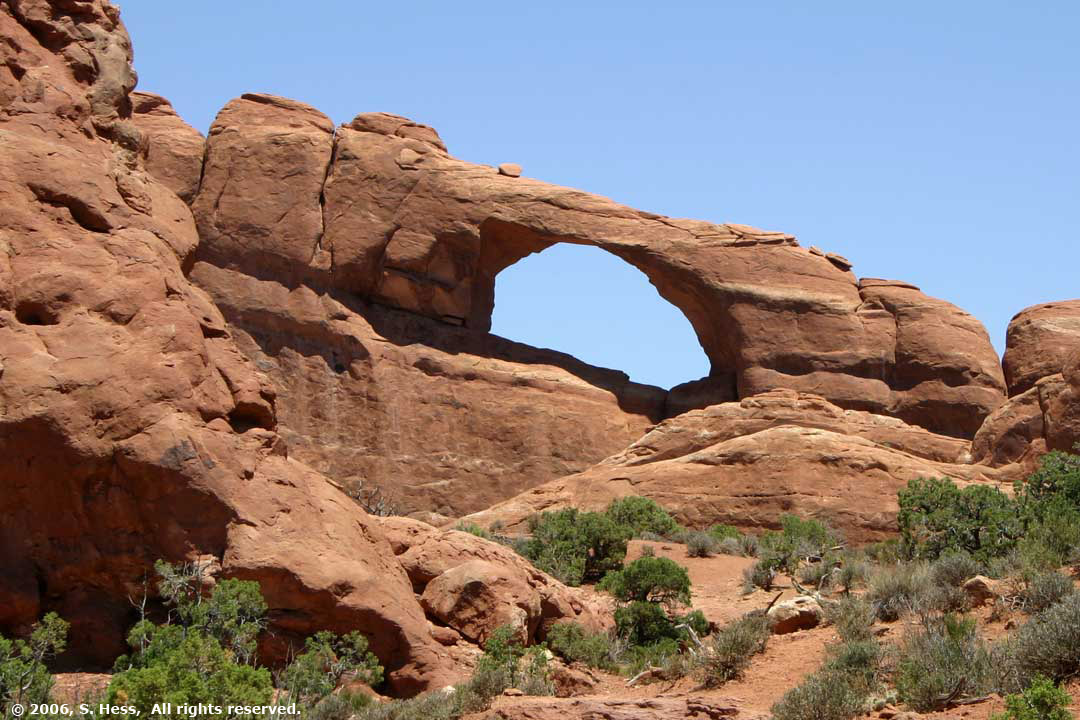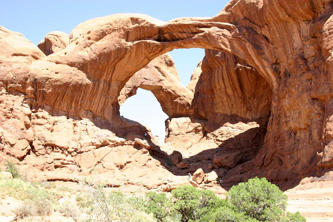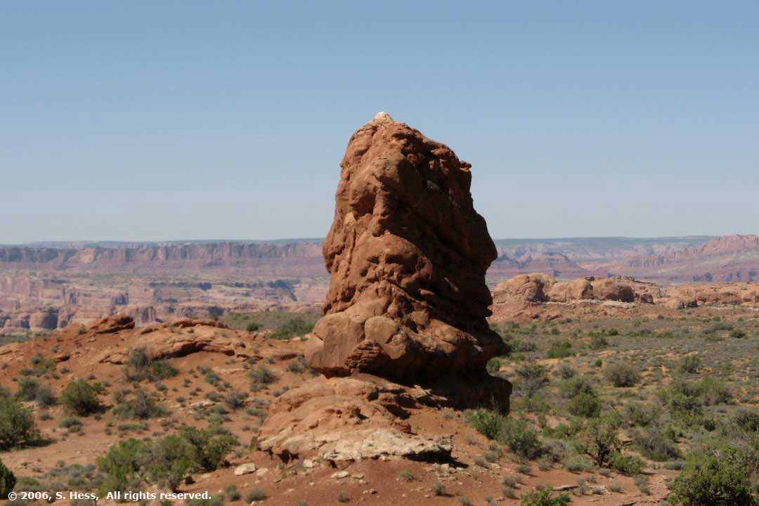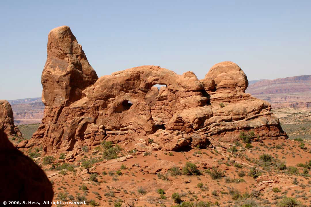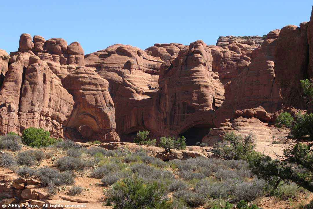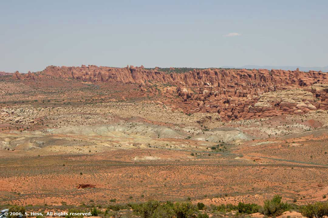 This morning we set out for Arches National Park. The entrance is about 9 miles north of the campground. The formations in the park are spectacular. We did most of the trails but the furthest, Devil's Garden. You really need at least two days (really two mornings if you get an early start) to do justice to Arches. Devil's Garden is the longest maintained trail in the park, roughly 8 miles. The literature recommends that you allow at least 2-3 hours each way. By the time we got to the entrance to Devil's Garden, it was already past noon and the heat was getting to us. Arches National Park has the largest amount of natural stone arches in the world. We only saw a few, including some of the best known, Delicate Arch, which appears in Utah's license plates, and Double Arches. The Devil's Garden trail has eight arches. In addition, it has thousand of other natural formations. All of the formations in the park are the work of wind and water. Some of the trails are reasonably easy to tackle and others are more severe. For example, to see the Delicate Arch, you can hike a strenuous three mile (round trip) trail that gets you to the base of the arch. The alternative is going to the Delicate Arch Viewpoint. Even this alternative gives you choices, a hundred yard flat trail to a viewpoint or a moderately strenuous hike to the upper viewpoint. The pictures of the Delicate Arch, below, were taken from the upper viewpoint. Arches National Park Scenes |