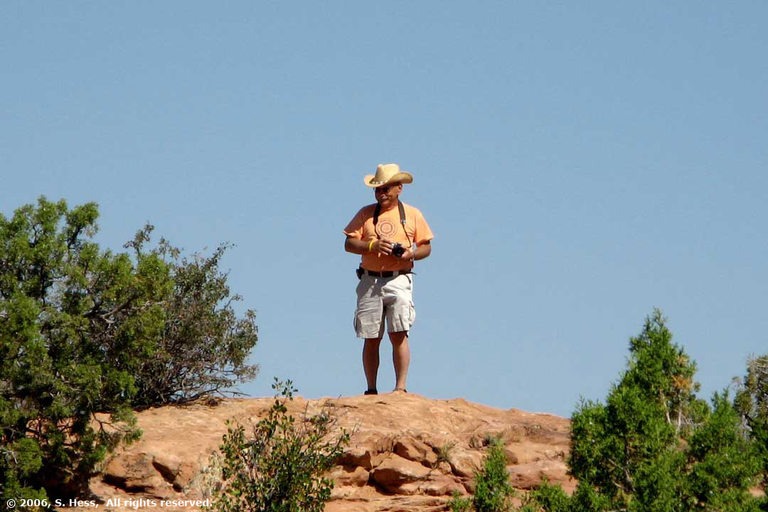 Moab at 5:15pm, and the temperature is only 101. They (whoever they are) say that it is a dry heat and that is more bearable. I learned from my previous trips to the Southwestern desert that hot is hot. The word dry is important, because the heat does dry you out. Anyone doing any kind of outside activity in this climate has to be prepared to rehydrate. The penalty for not carrying enough water is severe... you could die. We took a quart of fluid each and had nothing left when we returned to the campground in the early afternoon.