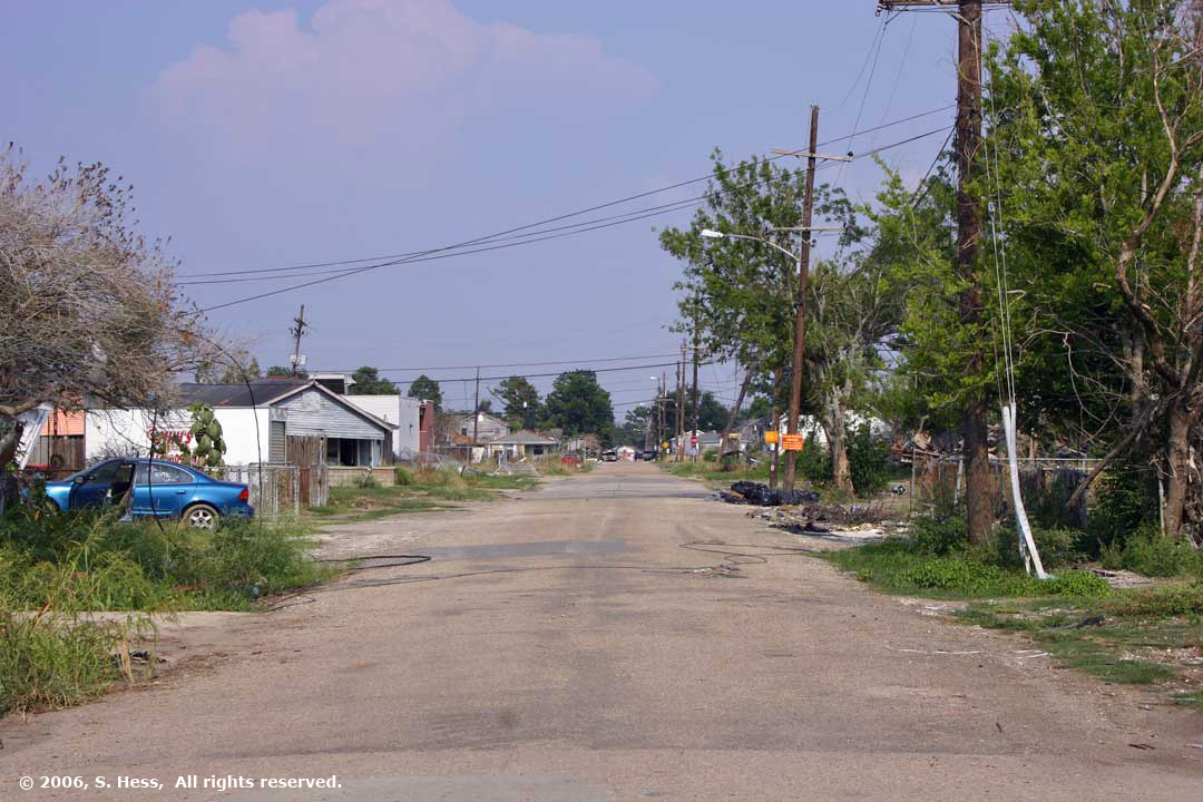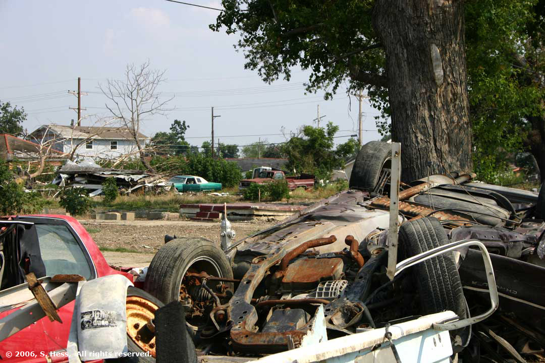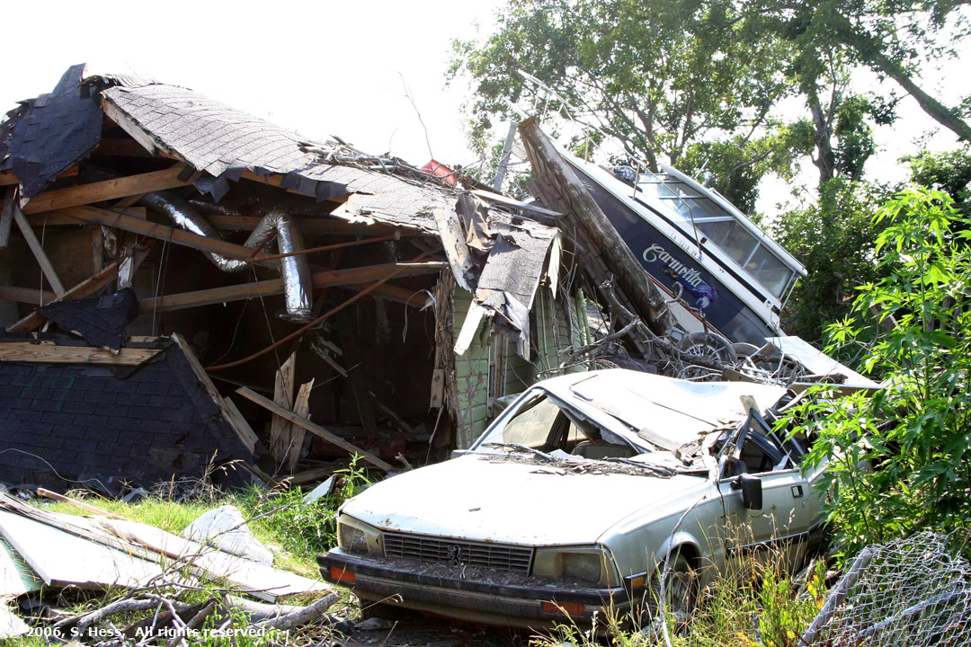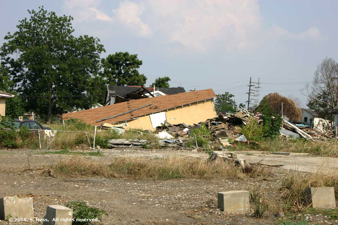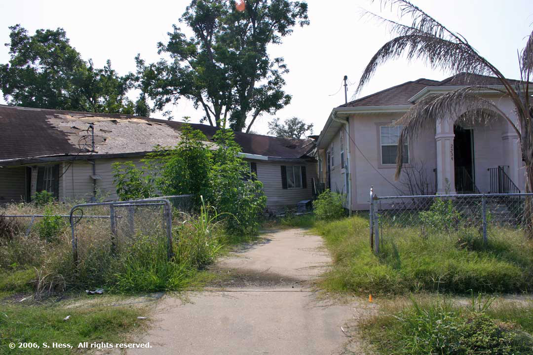 Today we met our nephew, Adam Hess, who is working on his Masters at Louisiana State University in Baton Rouge. Adam took us to the Lower 9th Ward, scene of some of the worst destruction from Hurricane Katrina. He told us that the area was cleaned up a bit since his last visit to the area. Much of the debris that was in the streets has been moved off so that traffic could flow. A number of the houses have been demolished and all that is left are concrete supports and the occasional front stoop. The area we visited was only a few blocks from one of the levee breaks and the impact of the rushing water is amazing. Houses were moved off their foundations or ripped apart. The few that survived somewhat intact had almost everything inside them destroyed. The water marks on the sides of the buildings or inside them indicates that the standing water was at least five feet deep.