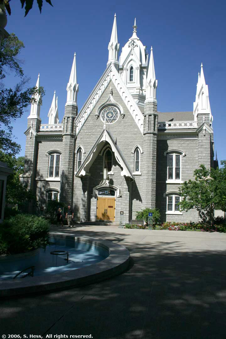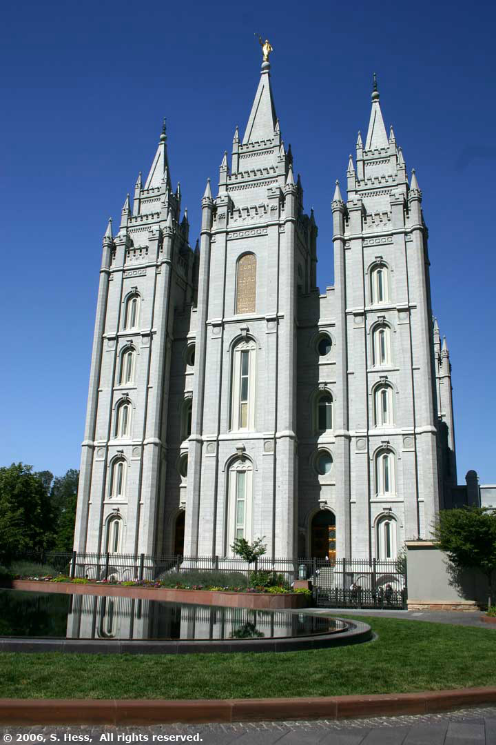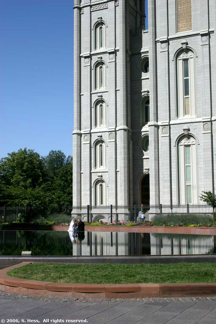 | The Temple construction was begun in 1853 and completed 40 years later. It is constructed out of granite quarried about 23 miles from Salt Lake City. The outer walls are nine feet thick at the ground and narrow to six feet at the top. While these pictures were taken, we could see one wedding party entering the Temple and another (top, right) was having their pictures taken. | ||||||||||||||