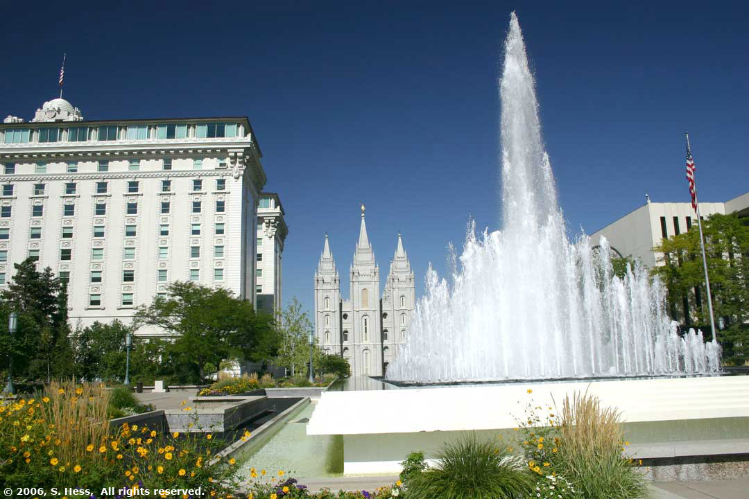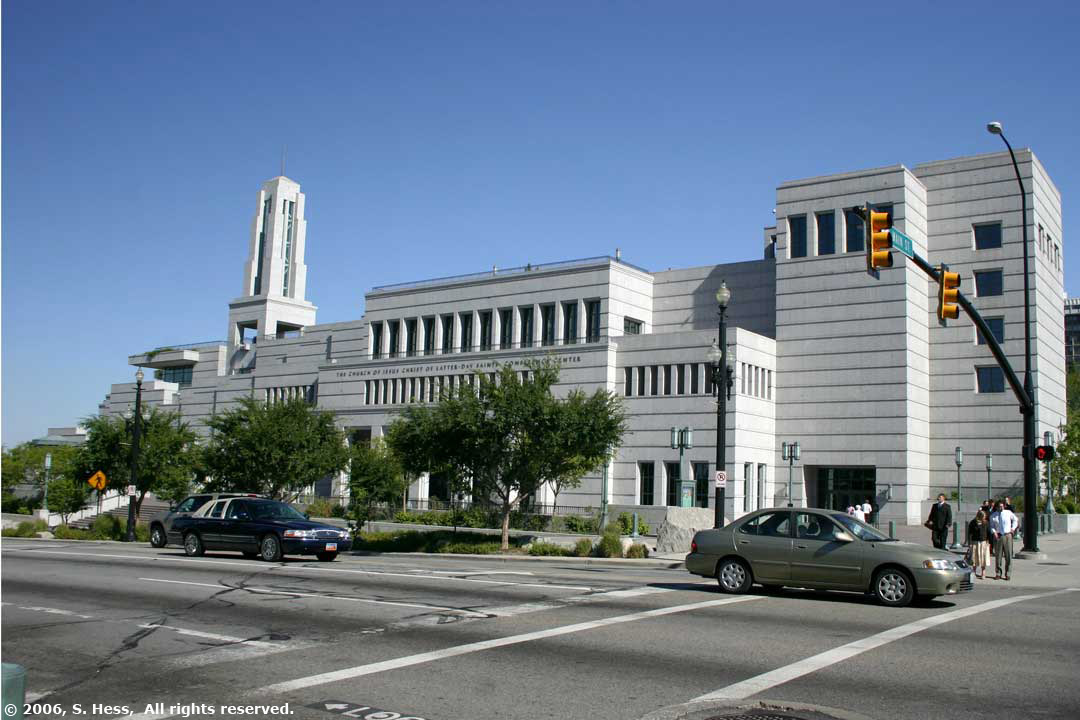 The Temple as seen from the front of the Church Office Building. The Joseph Smith Memorial Building is at left.