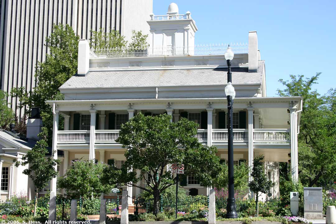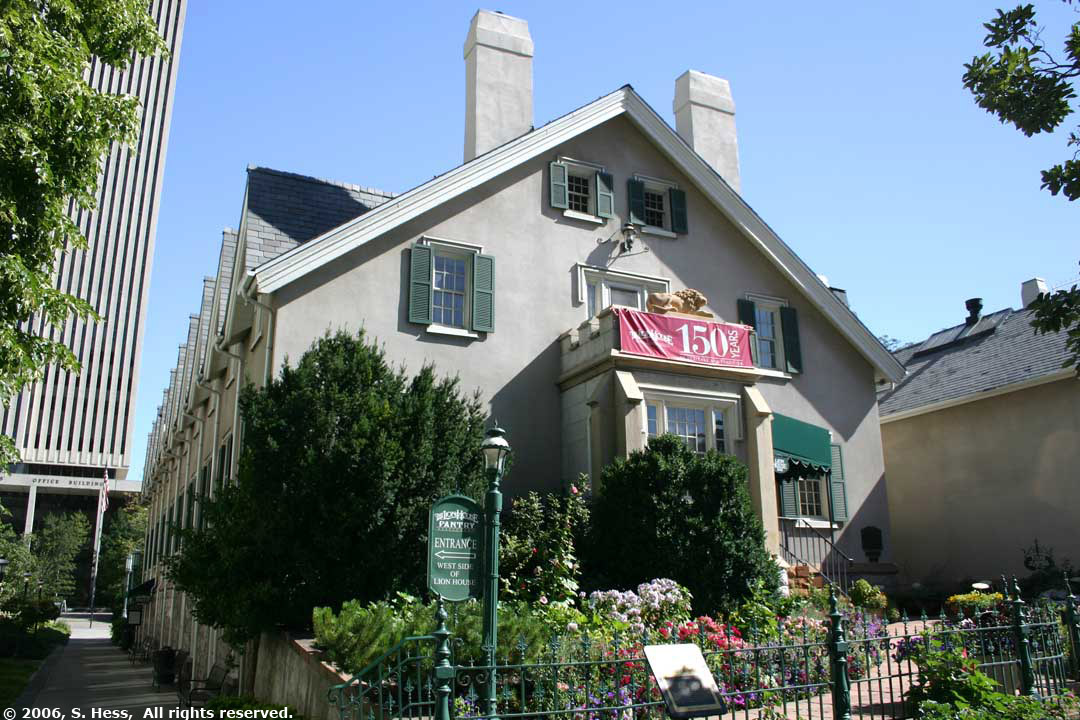 | The Lion House, built by Brigham Young to house his family. The basement had a dining room with seating for 70. The ground floor had sitting rooms and bedrooms for wives and children. The third floor had bedrooms for children and childless wives, one under each of 20 dormers. |