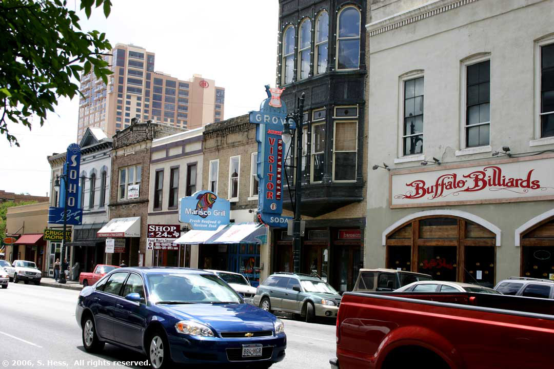 Historic 6th Street buildings serving as restaurants and clubs