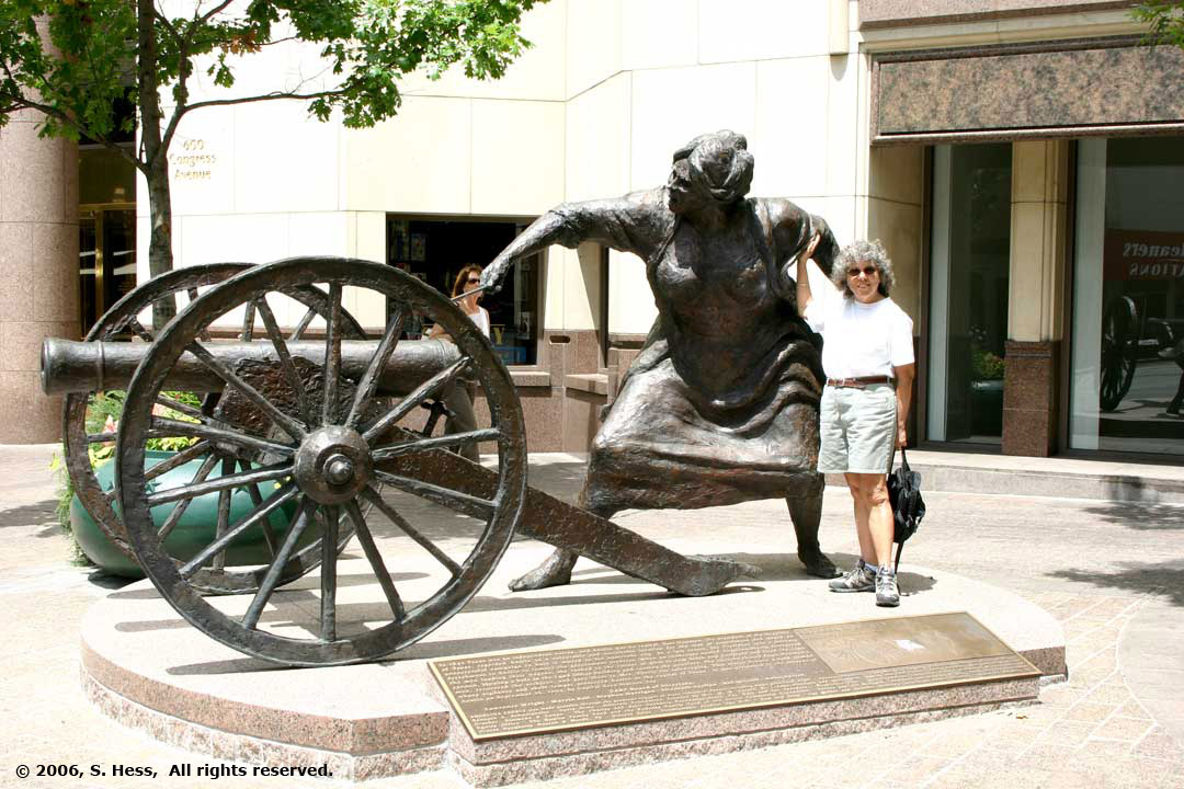 | Statue in honor of Angelina Eberly, a hot tempered resident who fired off a canon to alert the citizens of Austin that Sam Houston's men were making off with the state archives in a dispute over the location of the State Capitol. |