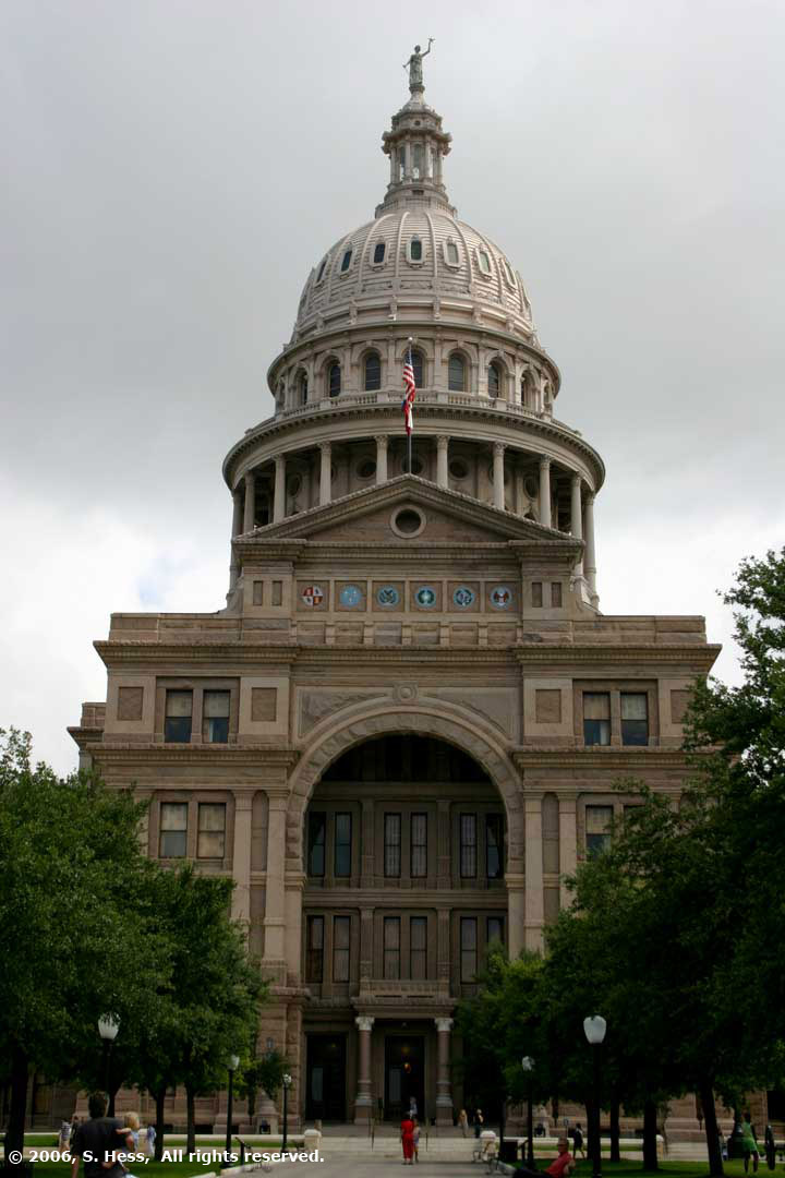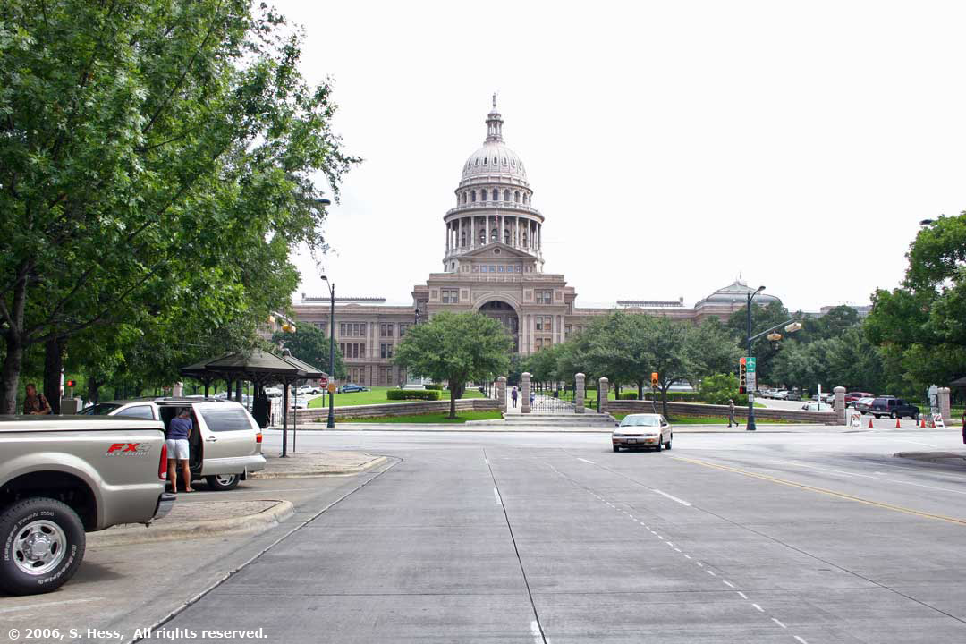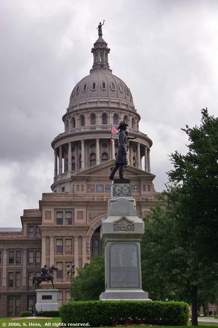 Texas State Capitol viewed from Congress Street (l) and from directly across 11th Street (r). The statue is a memorial to the volunteer firemen who have lost their lives in the line of duty.