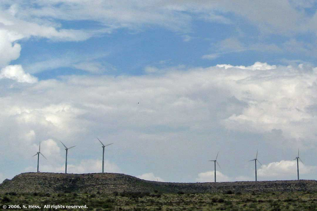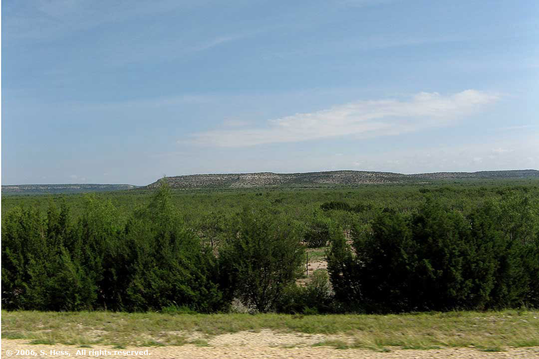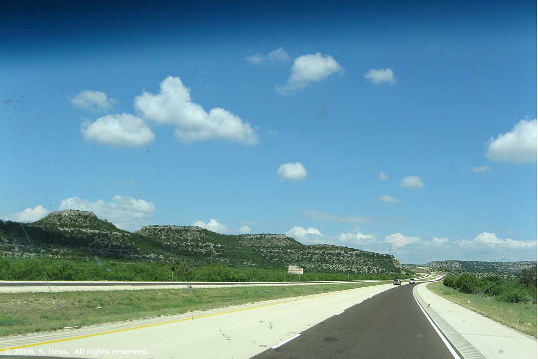 Today we drove on Interstate 10 from San Antonio to El Paso, a distance of 550 miles. We started in the Texas Hill country with its rolling green hills. As we proceeded west, we went up to the Stockton Plateau, a flat, high desert terrain at an 2400 foot elevation. Then we started up into the foothills of the Guadalupe Mountains and elevations up to 4700 feet.