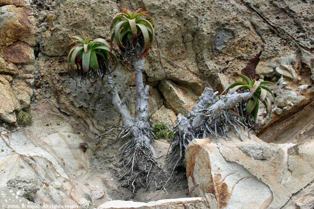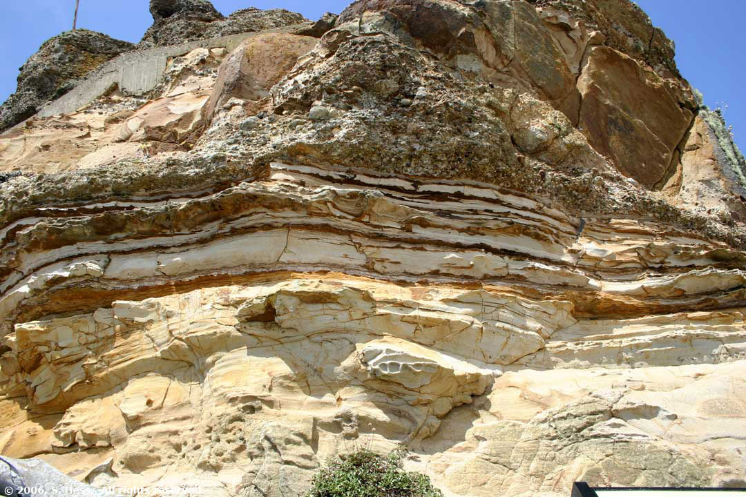 | The rock strata at Point Reyes consists of layers of sandy matrix embedded with pebbles of various sizes. Because some of the layers are not bonded as well as others, wind and rain erode them at different rates. This rock does not look like it could support life, yet we found this example of survival in the harsh environment. | |||||||||||