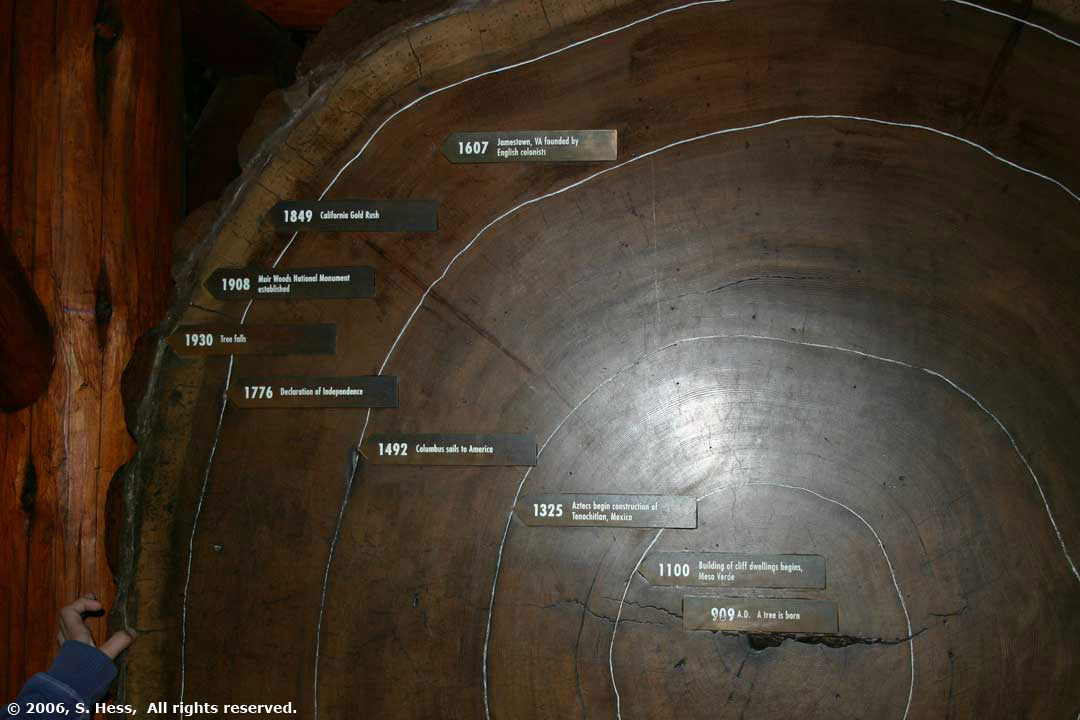 | Cross section of a 1,000 year old Redwood. The Markers identify historical events that occurred between the birth of the tree in 900 and when it fell in 1930 | |||||||||||
