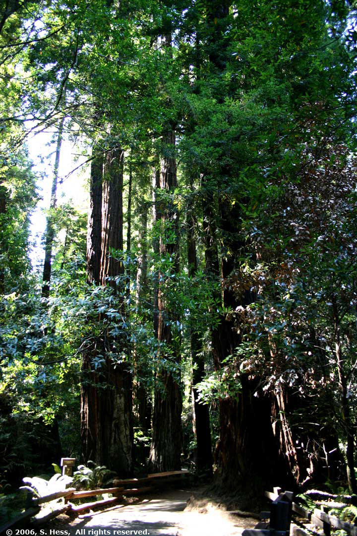 | It is difficult to capture these trees in photographs. I was practically on the ground and could not show the entire height. Even if I did, there is little else around that could give a frame of reference to their size other than other redwoods. | |||||||||||