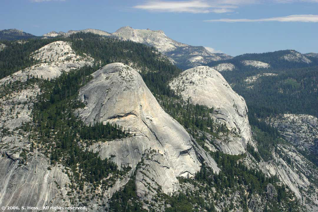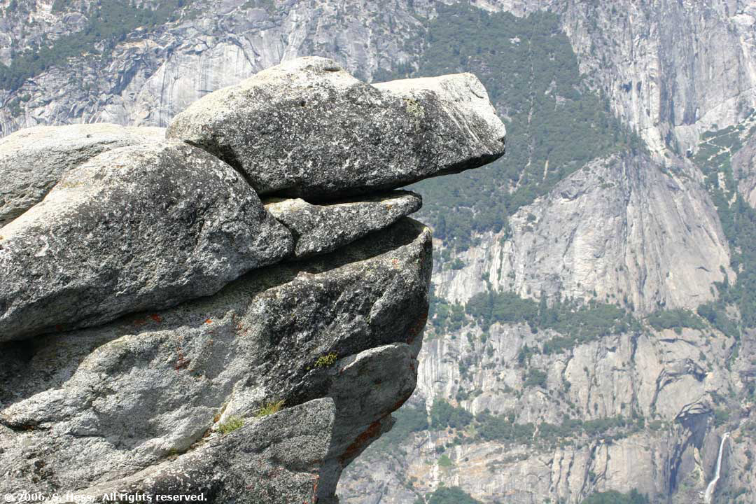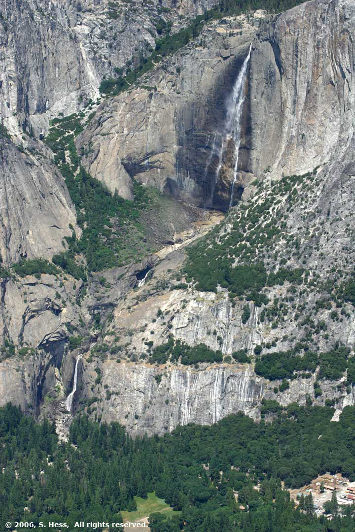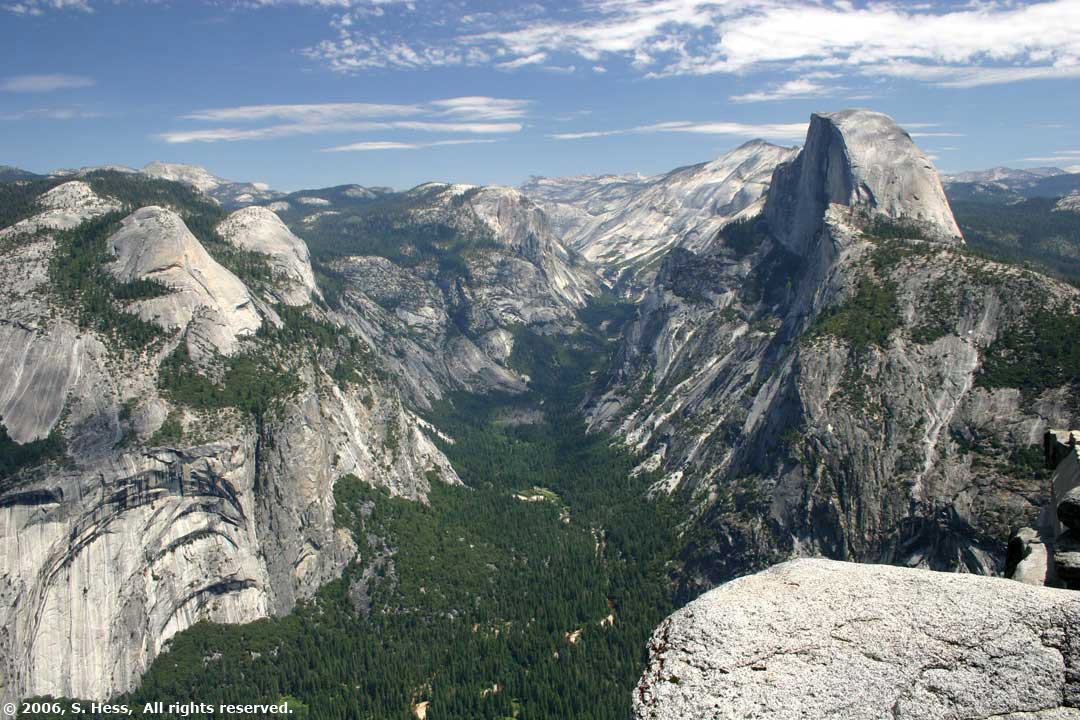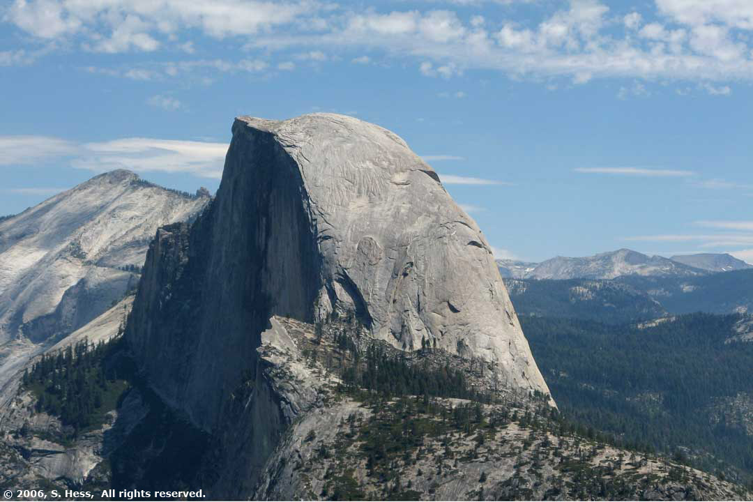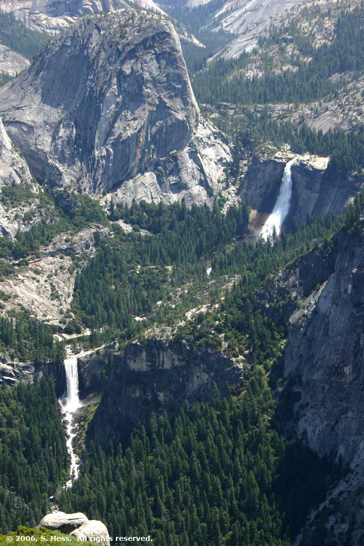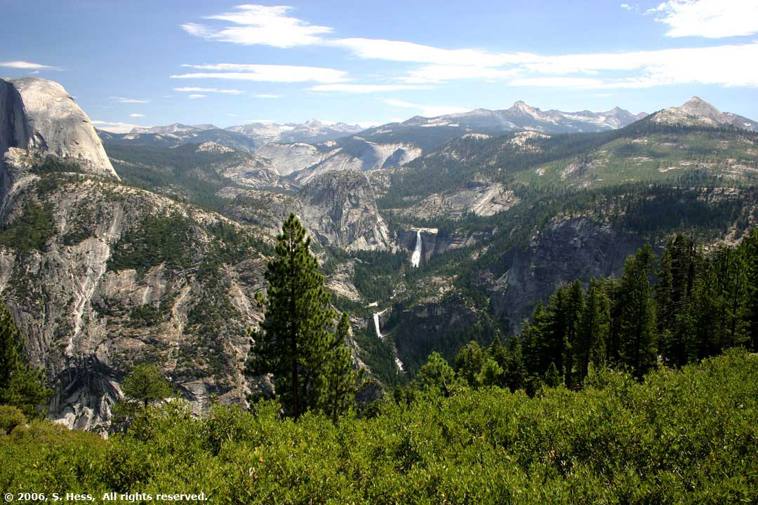 After we left the Mariposa Grove, we headed to Glacier Point, a thirty mile run that takes nearly an hour. Yesterday's view of the Yosemite Valley from within it was impressive. Now we were looking down at the valley from 2,600 feet above it. Glacier Point is on the south wall of Yosemite Valley and provides a panoramic view of the valley and the Sierra Nevada to the east. The view provides a different perspective of the valley and two of its icons, Half Dome and Yosemite Falls.