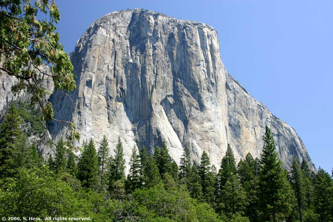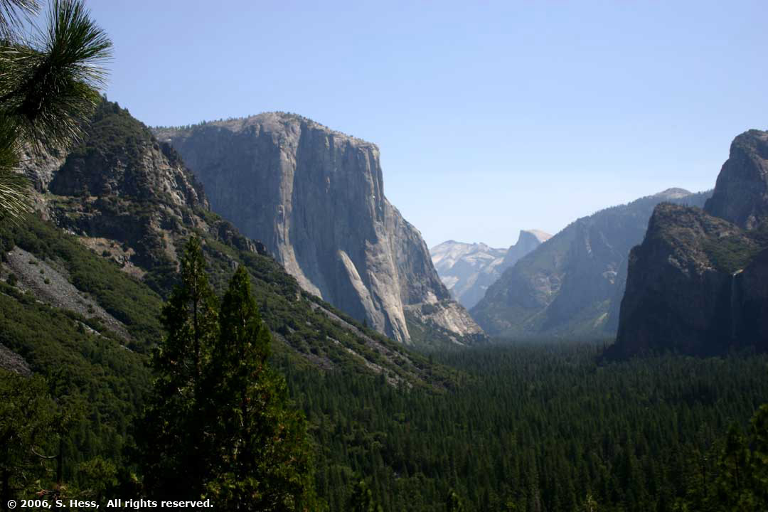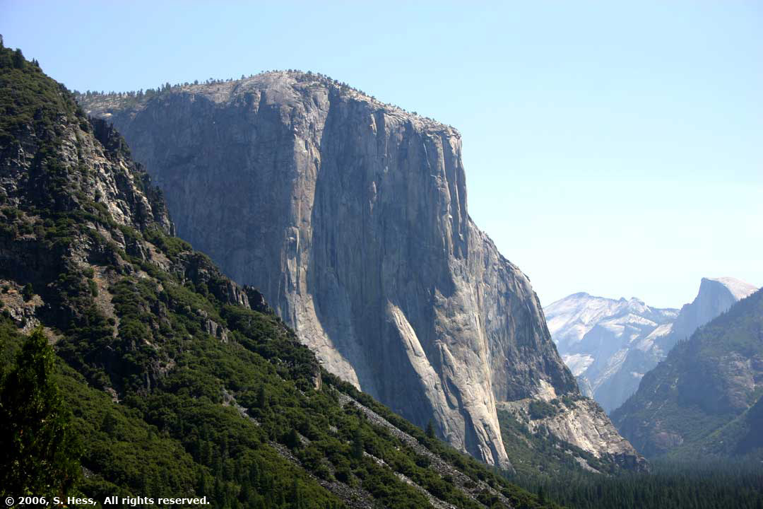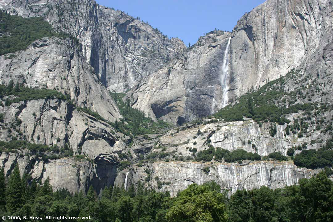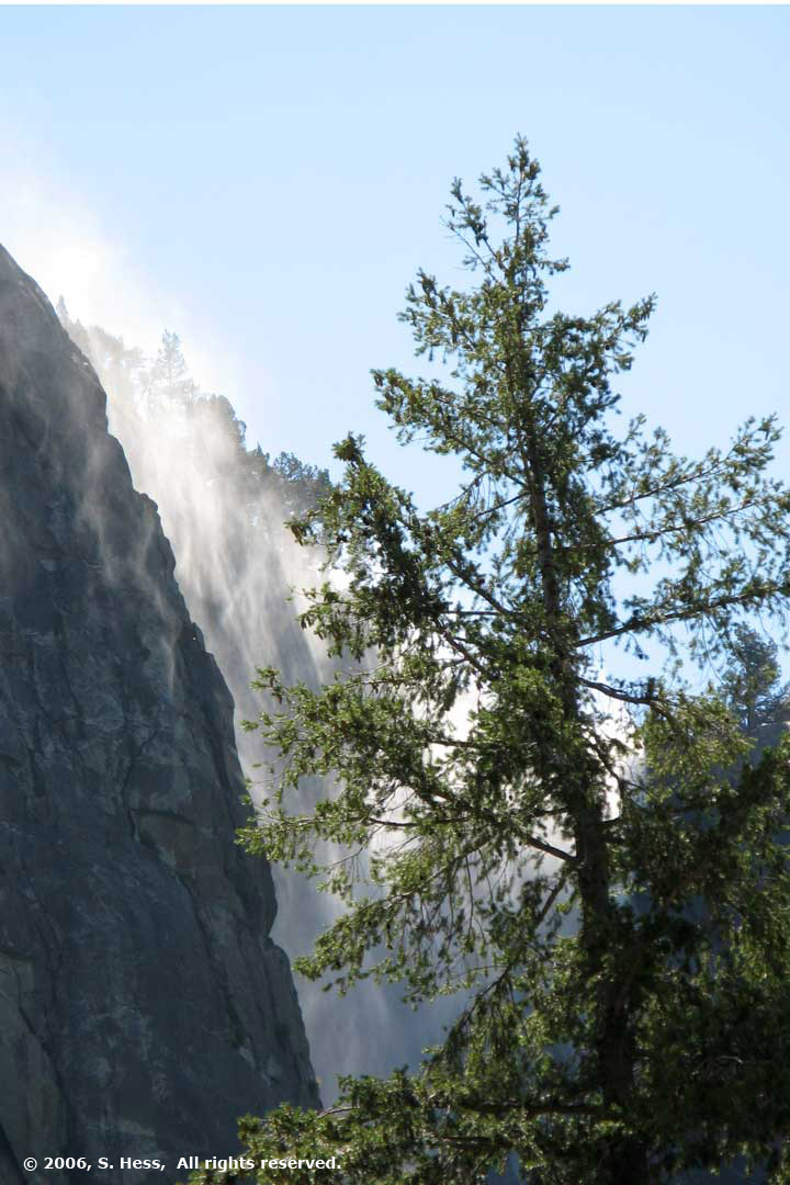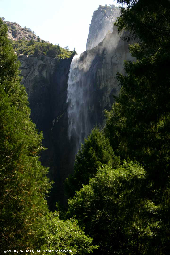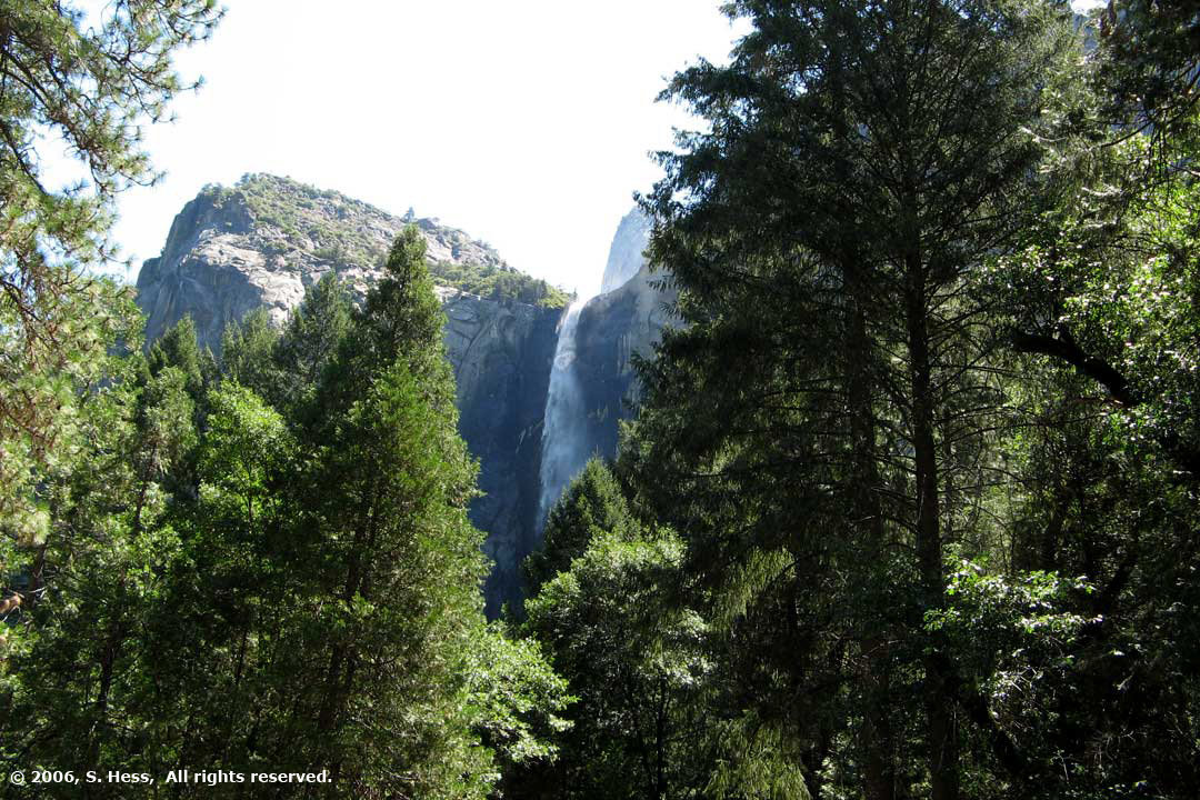 Yosemite National Park has had a certain mystique to it. I have seen pictures, particularly by Ansel Adams, that just wowed me and I wanted to see it for myself. So here we are. As I mentioned yesterday, the easiest, most direct route to Yosemite Valley, the heart of the park, was closed due to rock slides. We had two options, the south entrance or the north entrance. One of the campground staff has suggested the south route because it was a much easier route. So taking that advice, we headed for the south entrance, about 45 miles from the campground. Yosemite Valley is another 30+ miles from the entrance. The park is in the Sierra highlands so the roads meander and the average speed on them is about 35 MPH. As you approach the Yosemite Valley from the south, your first view of it is from quite high up and it is amazing. Once you get into the valley, you can get better views of some of its famous landmarks, El Capitan, Bridal Veil Falls, Yosemite Falls and Half Dome. Bridal Veil Falls is really beautiful and none of our pictures do it justice. When we arrived at the falls, the sun was directly above, and hard as we tried (including scrambling on some rocks below the falls to get a better shot), we could not eliminate the glare. The pictures that we did take were from the approach trail.