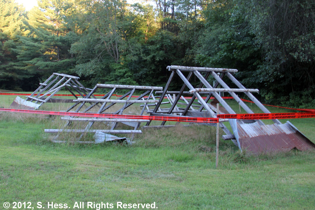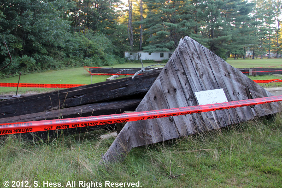 This summer we decided to spend a few weeks in one place and just "hang around." We selected New Hampshire because we have not done any touring around the White Mountains and Lakes Regions for almost thirty years. We selected Campton as a base because the Branch Brook Campground is owned by a former colleague of mine and it was centrally located to the two regions. Our plan was to ride around in the mornings and then head back to the campground to read and relax. I had no intentions of maintaining a daily page for this trip and took only a few pictures (my total output was barely the same as the average daily picture count on previous trips). In the batch of pictures that we did take were a few that I decided to post (albeit a few weeks after we returned), so I created this page. Branch Brook Campground In August 2011, tropical storm Irene rampaged through the Northeast. Branch Brook Campground did not escape its wrath. The brook flooded a good part of the campground and our campsite, shown below, was covered by about six feet of water. The raging waters washed Turkey Jim's Covered Bridge (a historic landmark built in 1883) off its abutments and slammed it into the bridge that provided access to the bulk of the campground, essentially destroying it. The access bridge was replaced and there are plans to rebuild the covered bridge. On our fifth day in the campground the area was hit by a series of thunderstorms that produced a lot of rain. I kept a wary eye on the brook as it filled with fast running water. It peaked at about two feet above the previous day's flow, a level that kept it at least two feet below the bank on our side of the brook. |